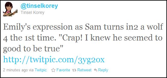 Tinsel Korey vient de placer cette photo sur Twitter en indiquant: Voici le visage d'Emily lorsqu'elle a vu Sam se transformer pour la première fois. "Zut! Je savais que c'était trop beau pour être vrai"